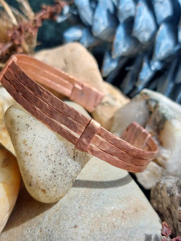 This beautiful Band is created by hammering three individual strips of copper to give it the lovely texture that catches the light. I then wrap thin copper bands to secure in place.