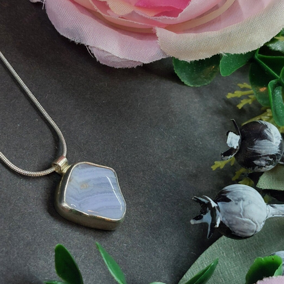 Blue Lace Agate, with singular crystal inclusion. Blue lace agate is known to be a very cooling and calming stone, endowing us with a sense of peace and tranquility. A powerful throat healer, it assists with verbal expression of thoughts and feelings.